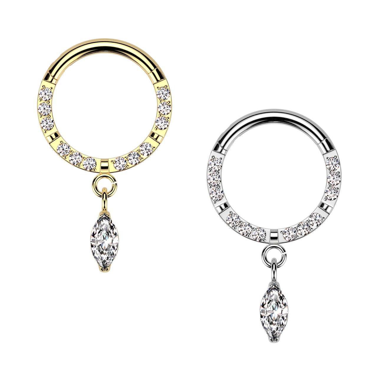 Implant grade titanium hinged segment ring with front-facing gems and a beautiful dangly cubic zirconia.