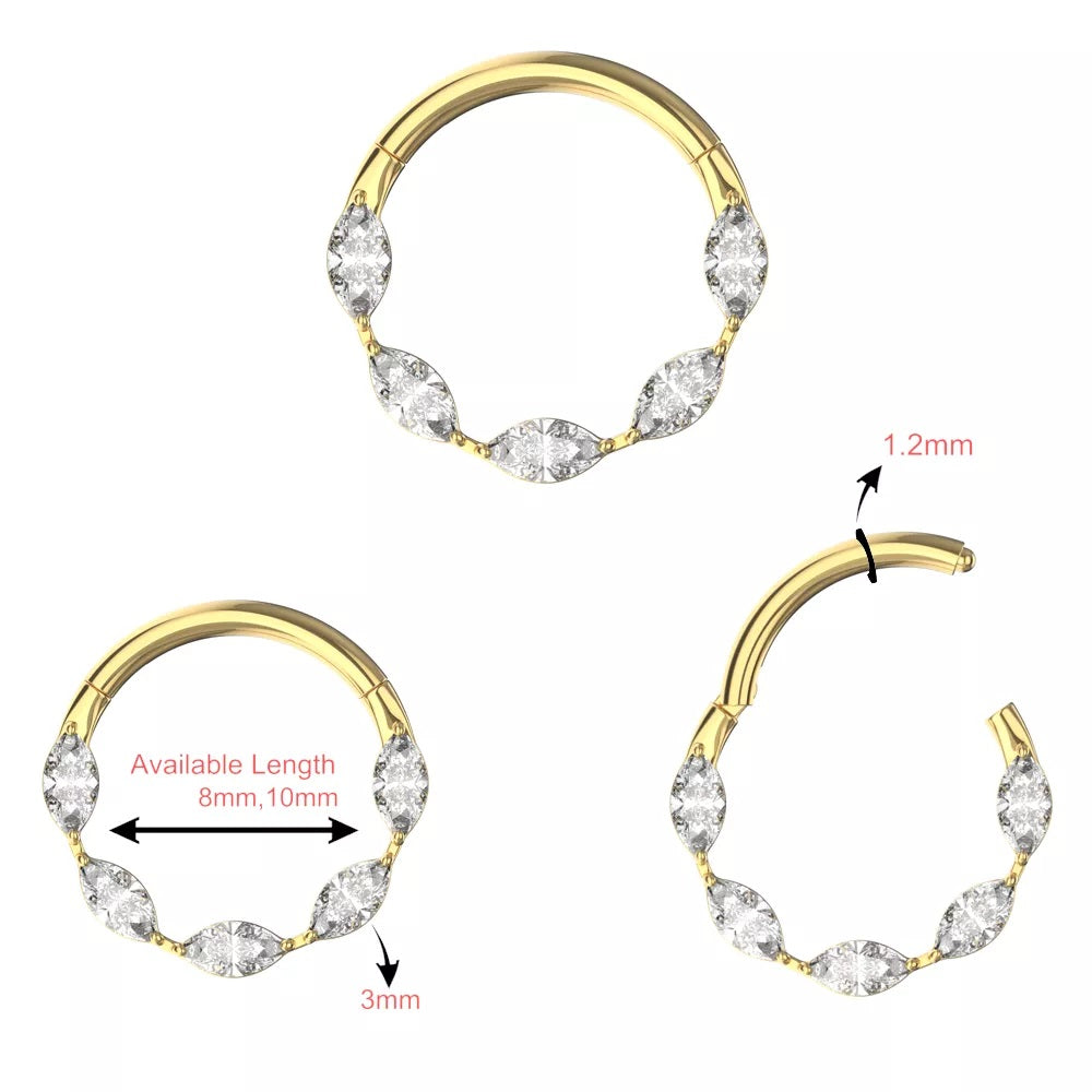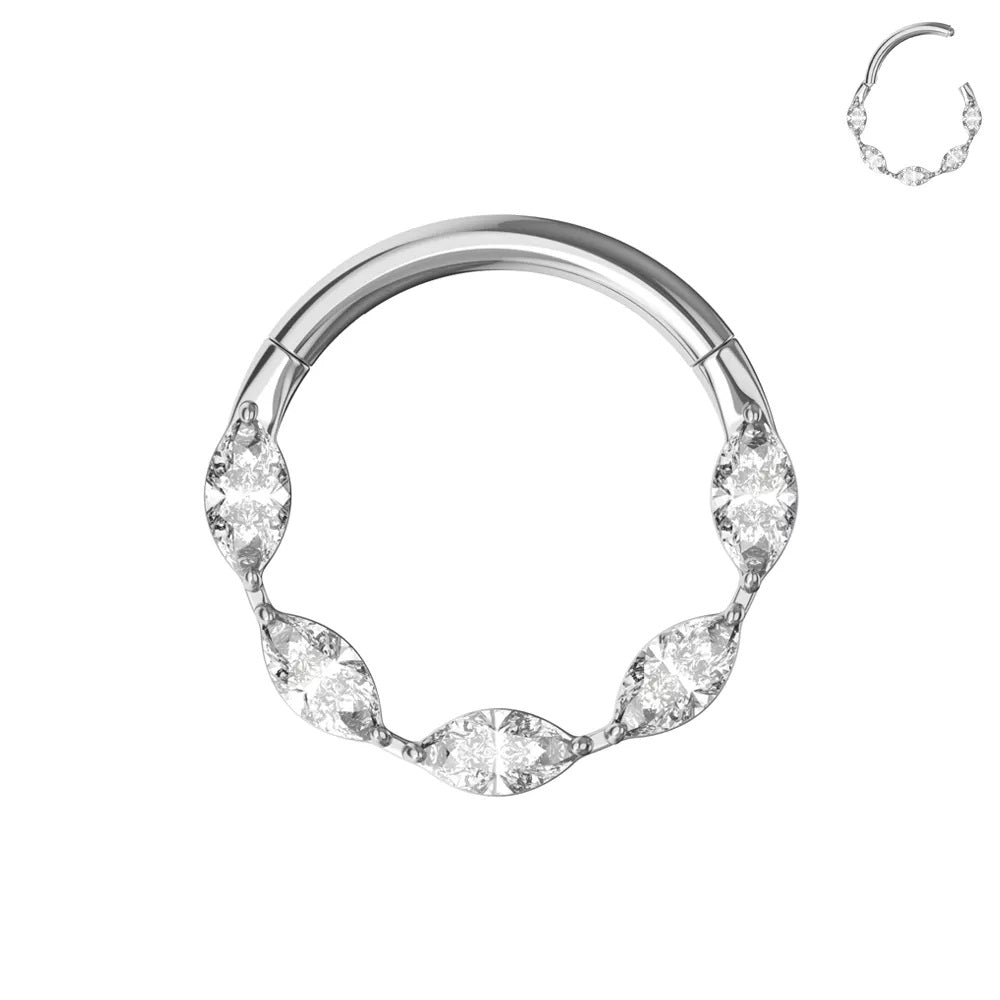Titanium hinged segment ring with a line of 5 marquise-shaped gems. Great for septum, earrings, or cartilage.  You can wear these clickers in the daith, rook, snug, or helix.